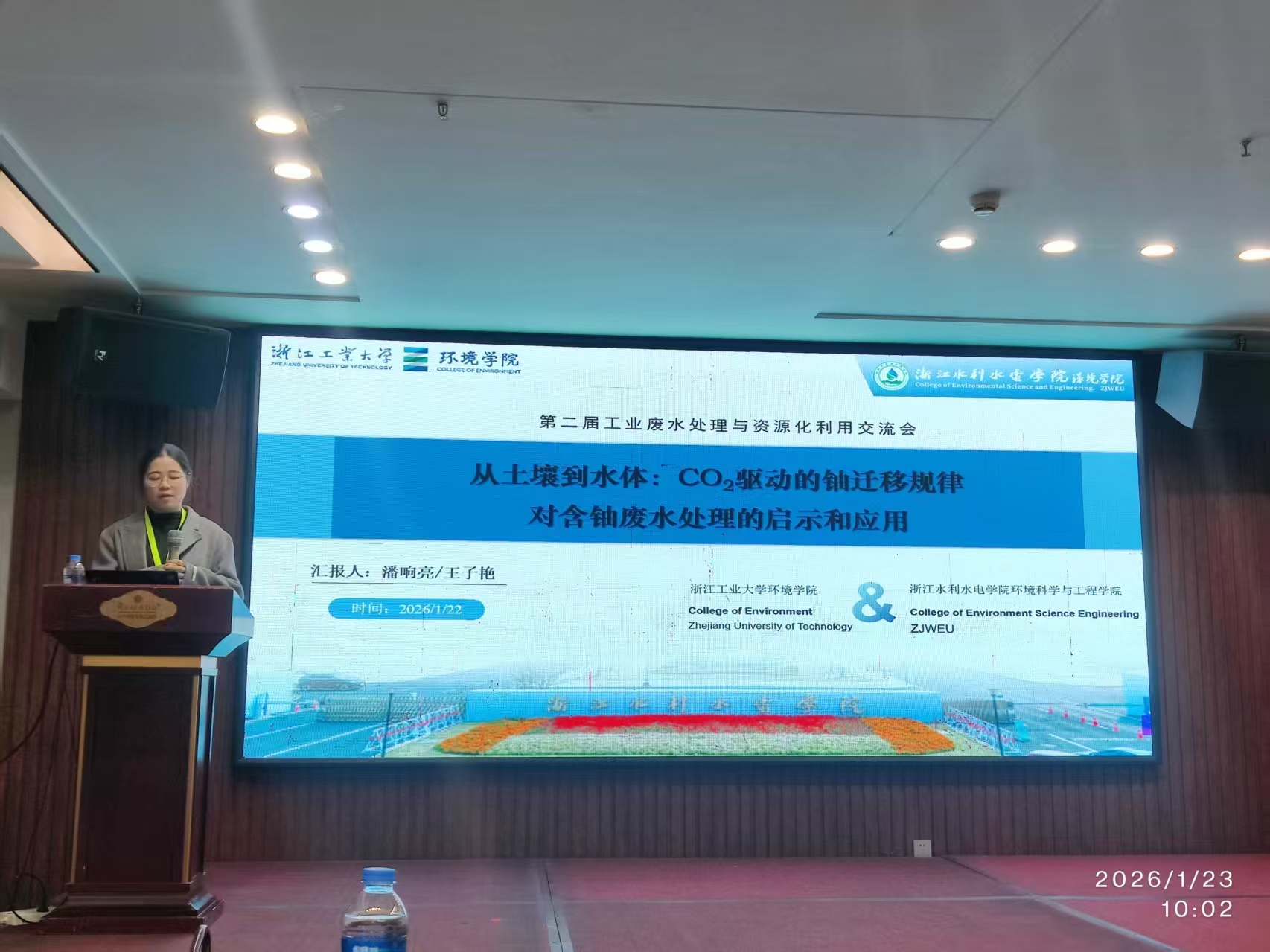 会议设立了“高难度工业废水处理技术”、“高级氧化水处理技术”、“生物处理技术”、“金属冶金与电镀废水资源回收”等多个专题分会场。王子艳老师在“金属冶金与电镀废水资源回收”分会场,作了题为《从土壤到水体:CO₂驱动的铀迁移规律对含铀废水处理的启示和应用》的专题报告。报告围绕铀地球化学行为,从研究背景与问题切入,详细阐述了关键研究内容、重要发现及其内在机理,进而提炼出对含铀工业废水处理具有指导意义的关键启示与技术应用路径。报告指出,深入理解铀在环境介质中的迁移转化规律,可为工业废水中铀的高效、稳定去除及资源回收提供重要的科学依据与技术思路。