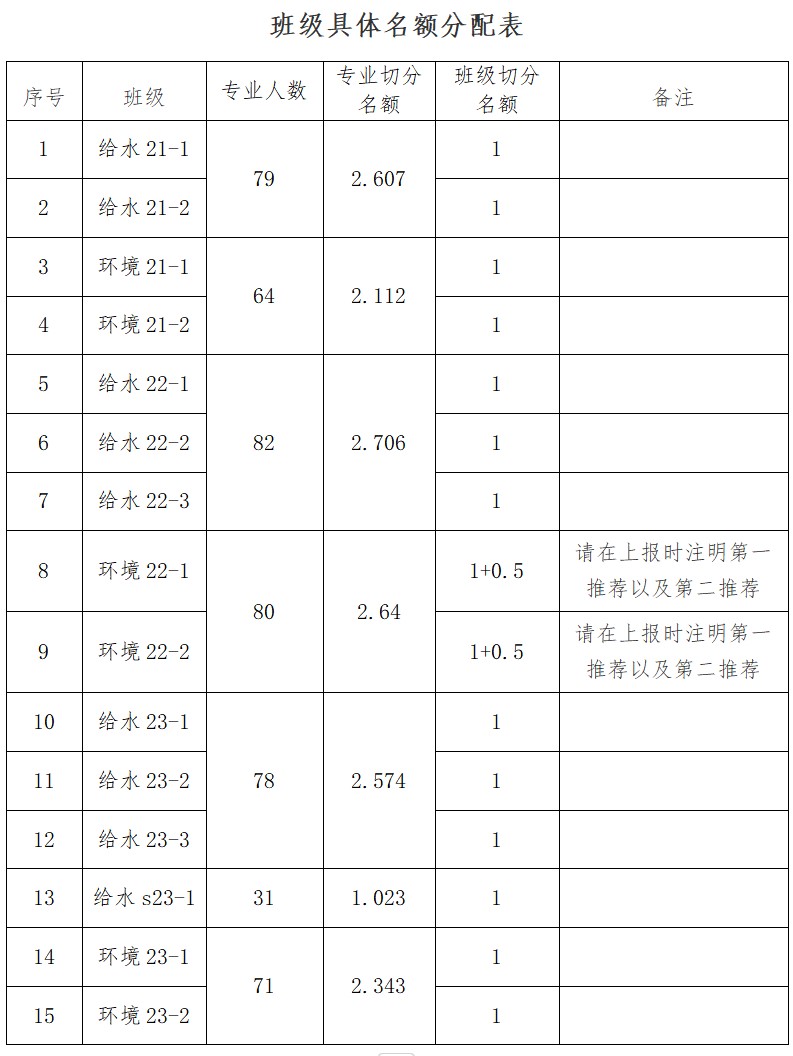 浙江省政府奖学金。经个人向班级申报,班级经班主任、评议小组或班级投票初评,太阳成集团tyc234cc根据学校下达的名额,组织学院评议小组开展复评工作。学生处审核学院推荐上报的材料后报学校审定,最终确定本科生省政府奖学金推荐名单。环境学院总名额为16名,班级具体名额分配如下。